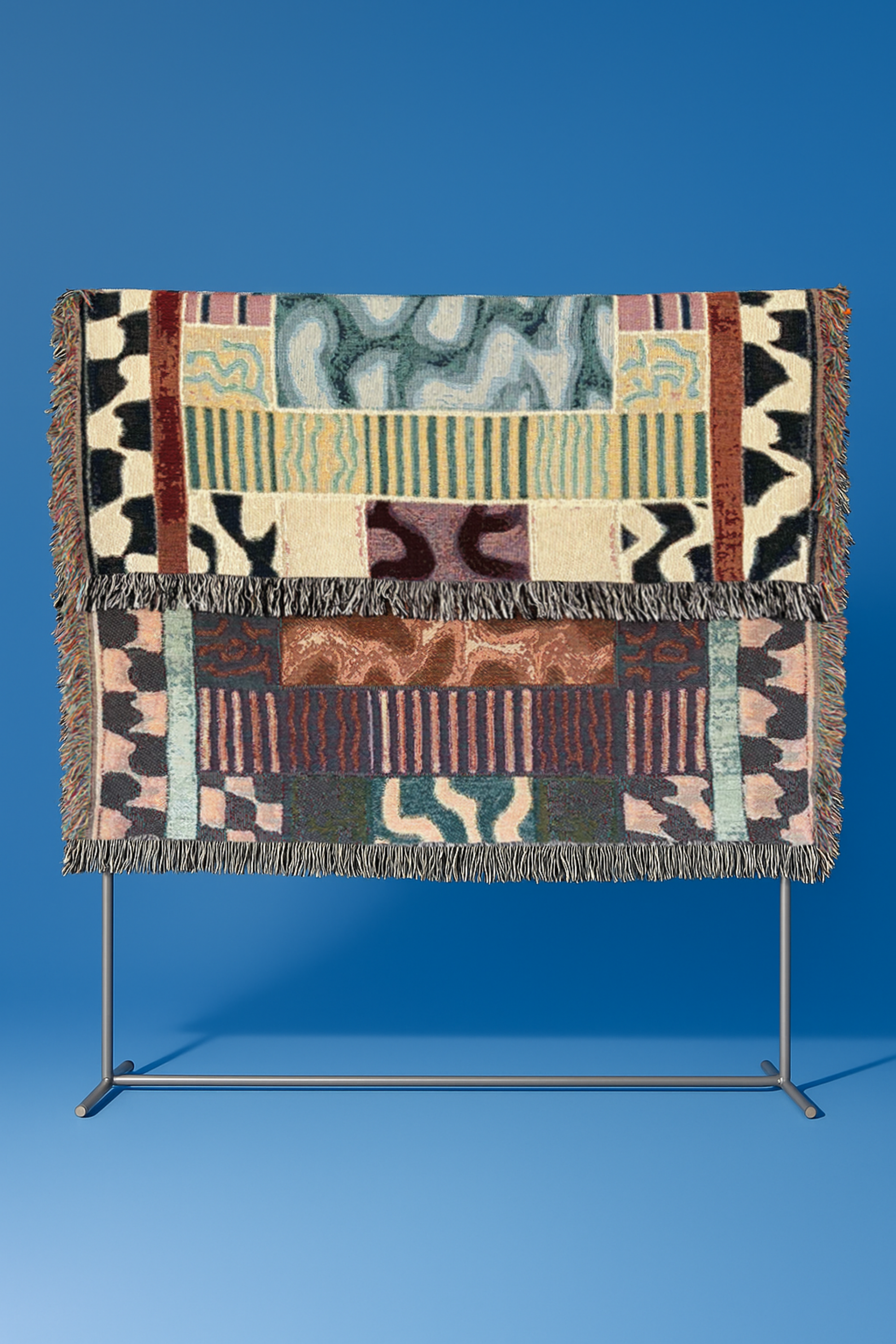 Inspired by an ornate pool, The Piscina Woven Throw Blanket layers rippling teal forms, dusty lilac, warm clay, and bold checkerboard edges into a composition that feels like stepping into a dream - soft, surreal, and quietly architectural. The dark center anchors everything, giving the piece a sense of depth and intention, almost like a window into another room.